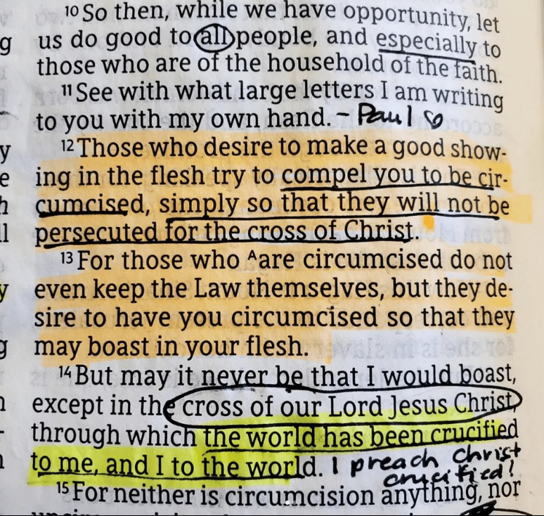 Those who desire to make a good showing in the flesh try to compel you to be circumcised, simply so that they will not be persecuted for the cross of Christ.