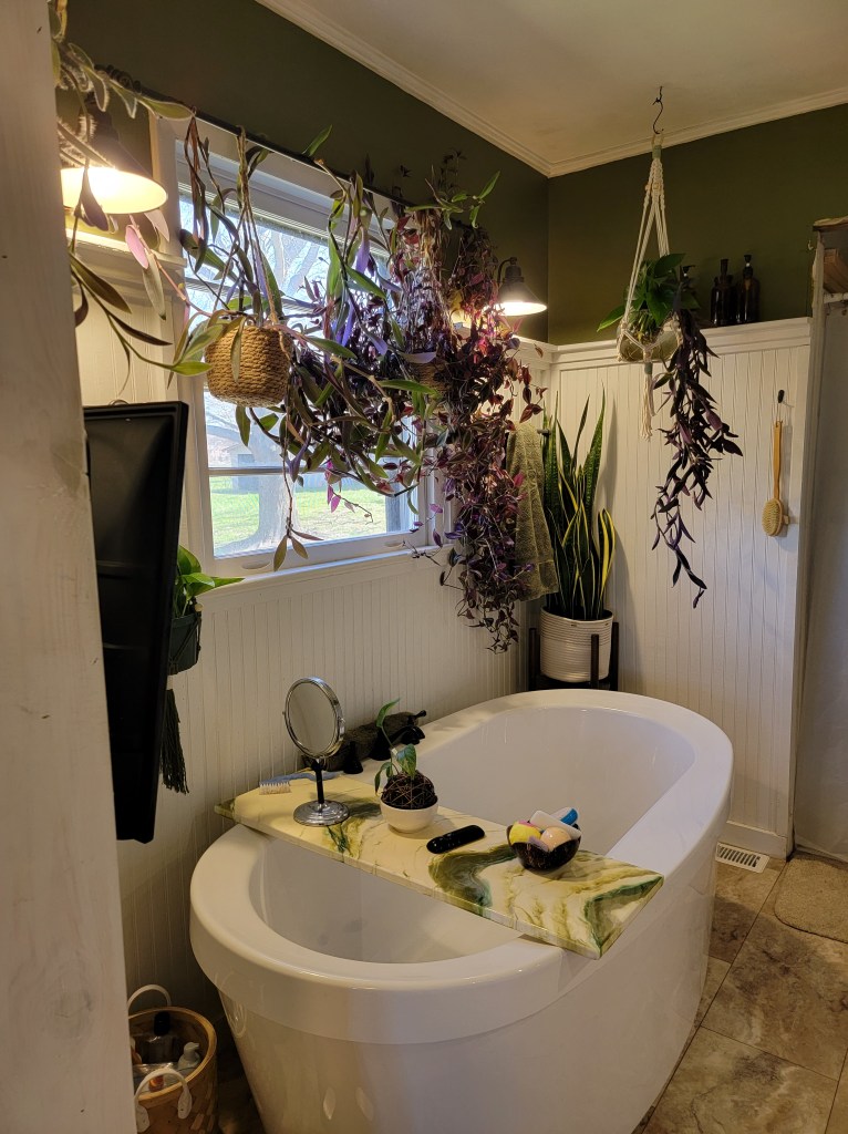In terms of style, the owners decided to refinish old furniture that matched the age of the home. Because they found original hardwoods under the tacky, green carpet, they didn’t want to introduce another wood component to compete with the floors. They settled on a scrubbable Benjamin Moore Advanced alkyd paint in #1 high gloss. They threw in a couple of cast iron clocks, a layered king sized bed with many textures, an antique chair and a small portion of their houseplant collection. The master bath continues with the Greek Oregano, framed above white wainscotting.